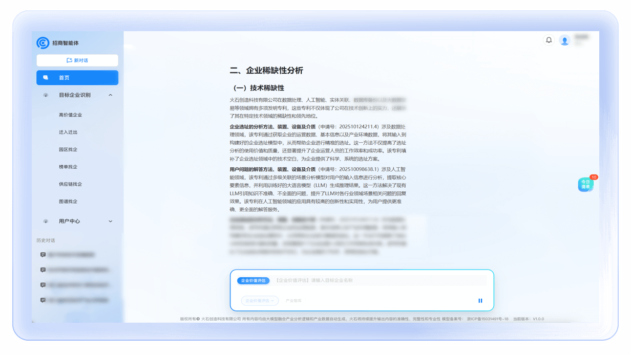 基于企业全景画像,自动分析企业与区域产业链协同度,生成企业价值评估报告,项目价值研判从3天 缩短至10分钟